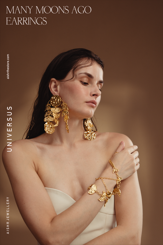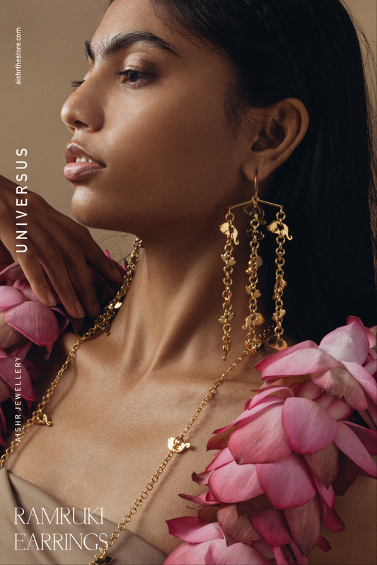 Inspired by the universe, this collection has all elements, from the sun to the moon, representing the fleeting day and night. It has birds, which represent flight and freedom, and Fish, which represent water bodies, balance, and tranquility. Wild animals symbolize courage and bravery; Elephants, strength and good fortune. Lotuses evoke growth in muddy waters, as in life we bloom beautifully out of muddy situations. The Heart reminds us of the love and comfort we have for one another, and Mother Earth, in the shape of a harmonious bell, represents the source of power and reminds us to give gratitude. Veins and Arteries, which carry life-giving oxygen, remind us of our humble beginnings, and of the role our mothers play in the cycle of life. Dhrishti (Nazar) man-made elements to ward off all negativity from our lives and our loved ones- Universus, a collection inspired by one world, one us.