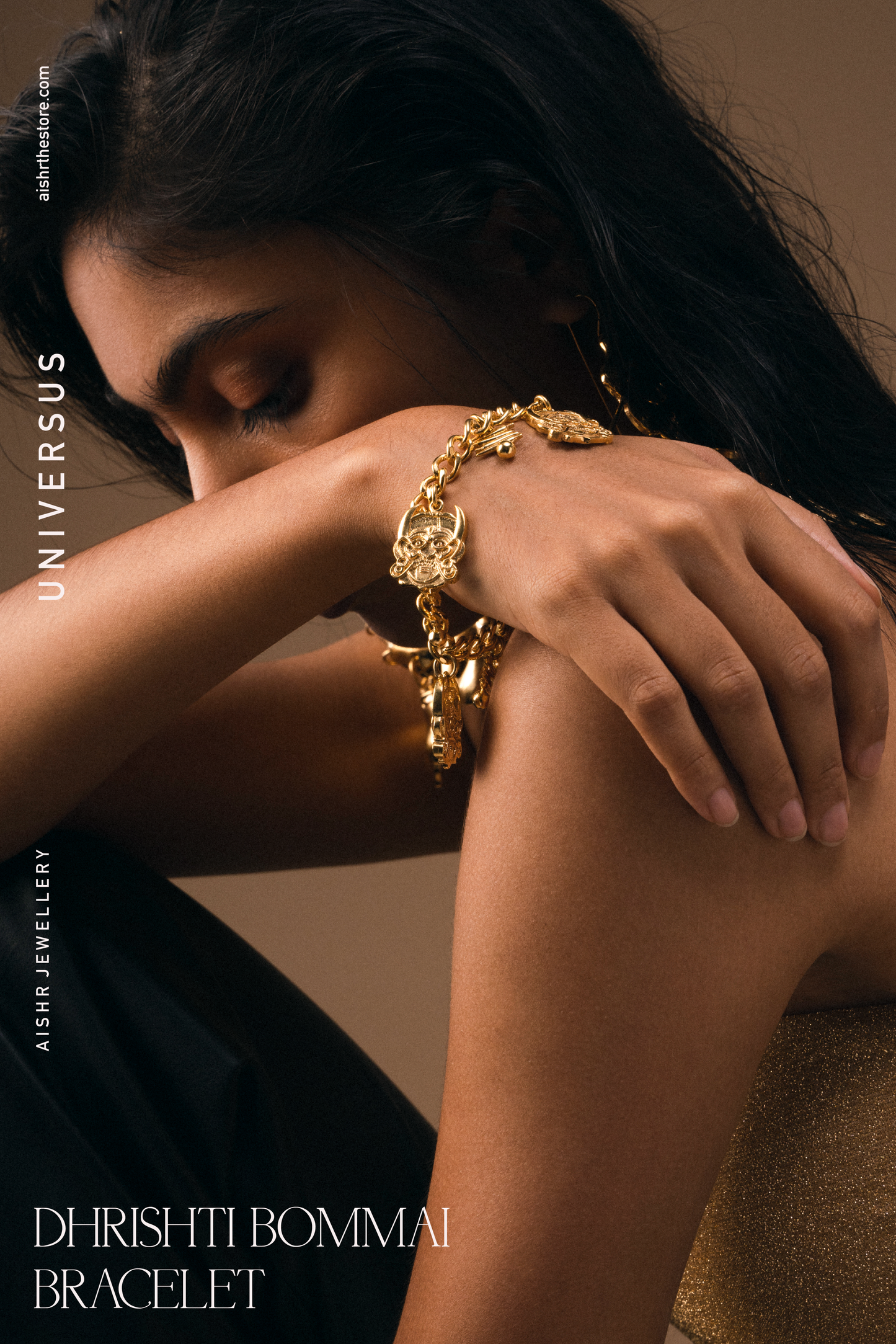 Handmade and handcrafted in 22k gold plated brass. This piece is inspired by the Dhristhi Bommai face (Nazar) to ward off all negativity.