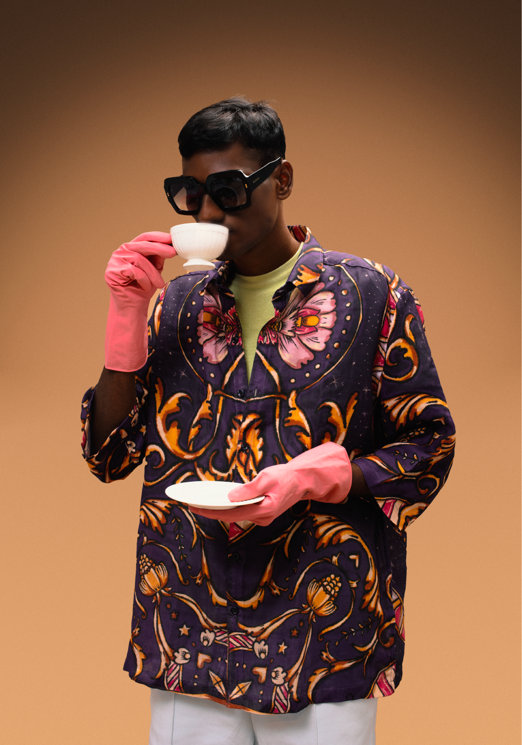 This shirt is made from organic muslin and printed with biodegradable dyes. Each shirt is cut and made, and therefore the print placement will slightly vary from the design shown on screen.