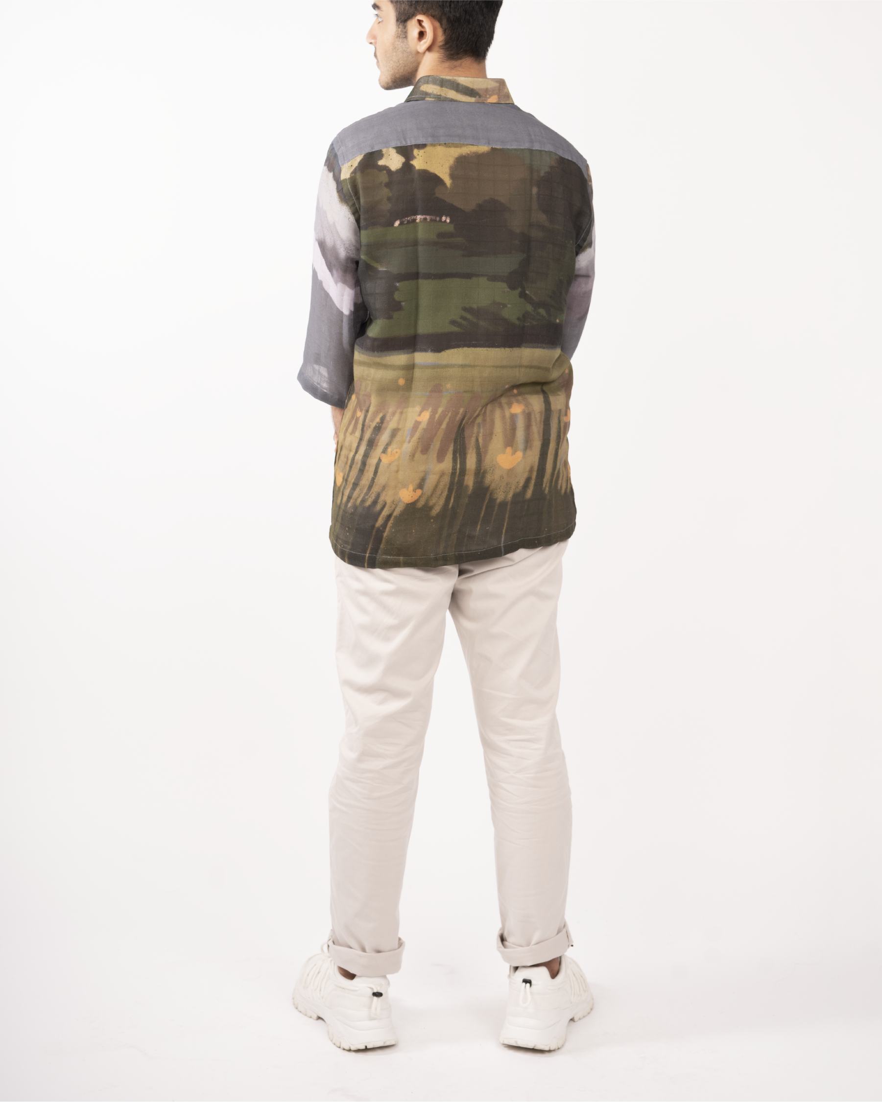 This shirt is made from organic muslin and printed with biodegradable dyes. Each shirt is cut and made upon order, and therefore the print placement will vary from the design shown on screen.