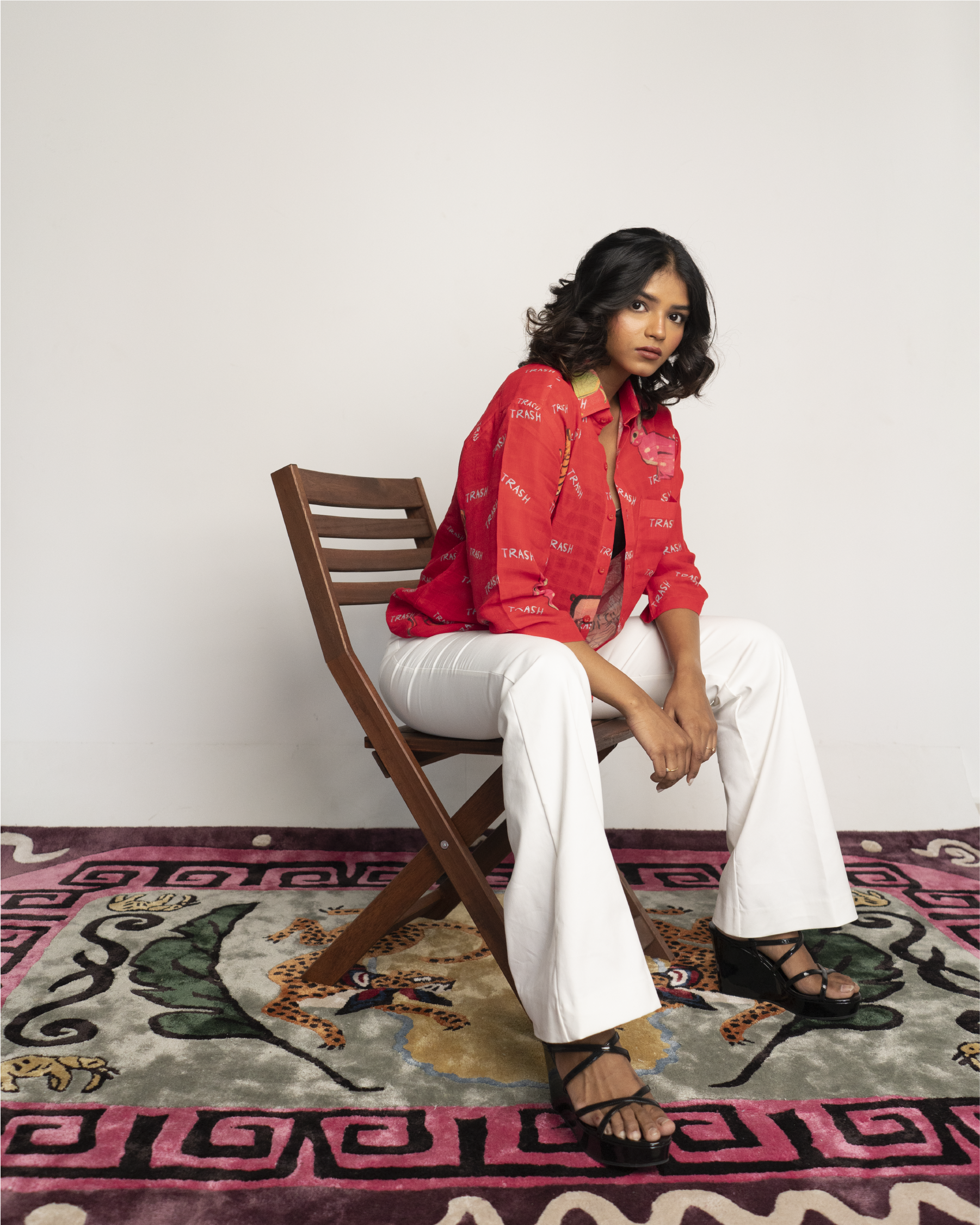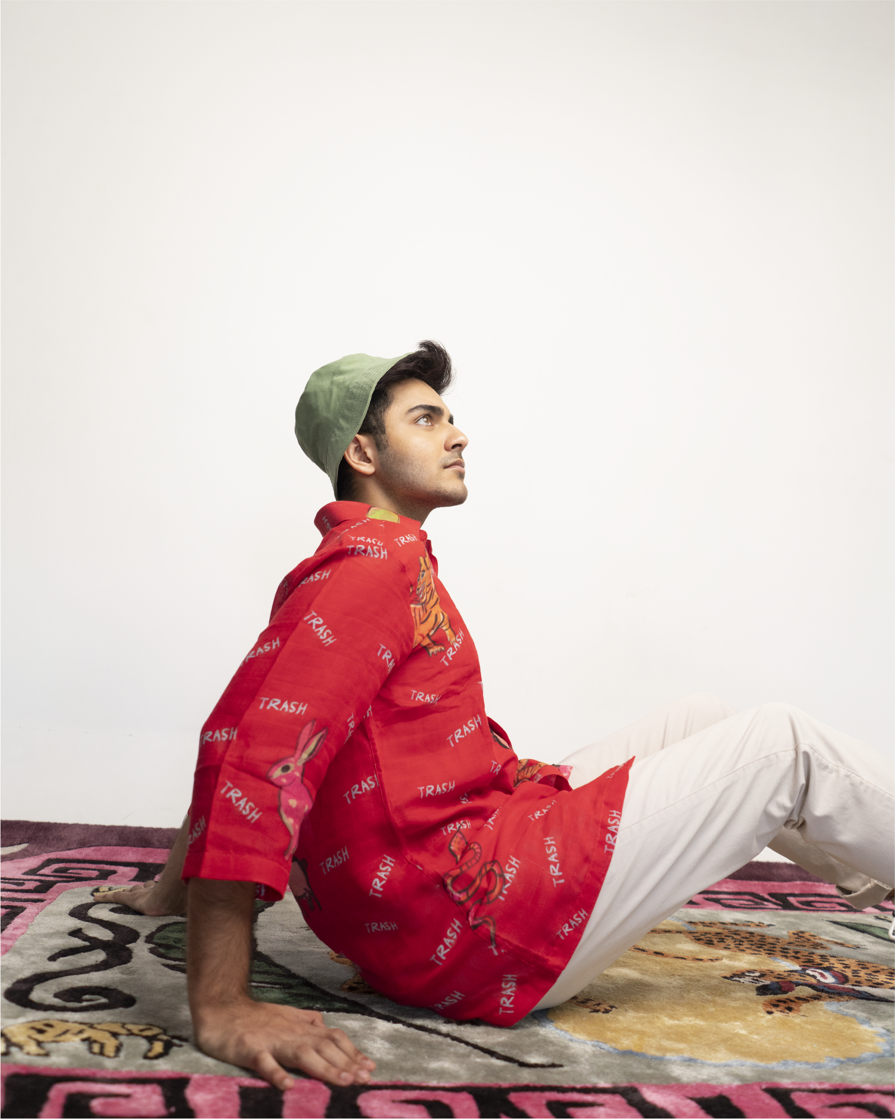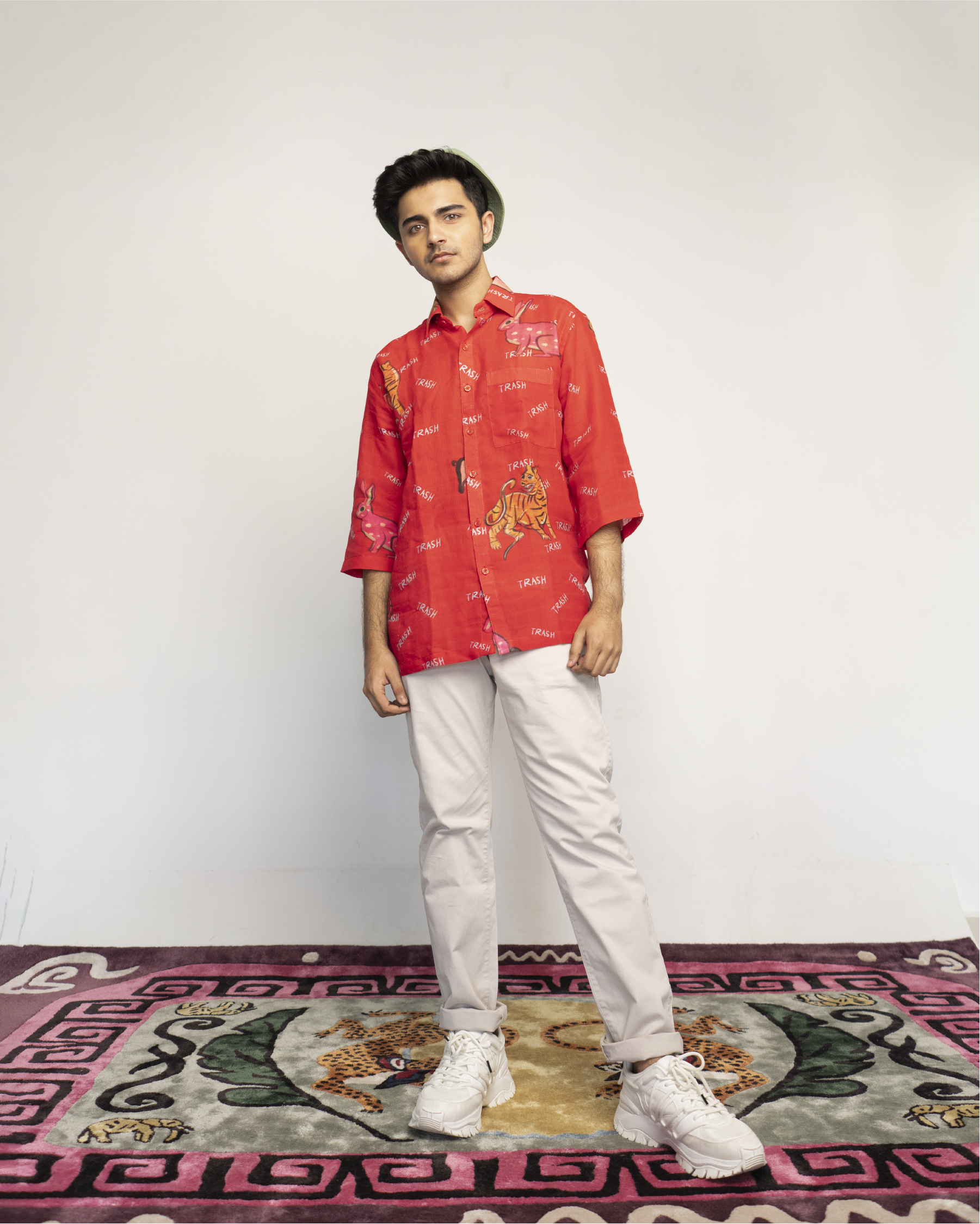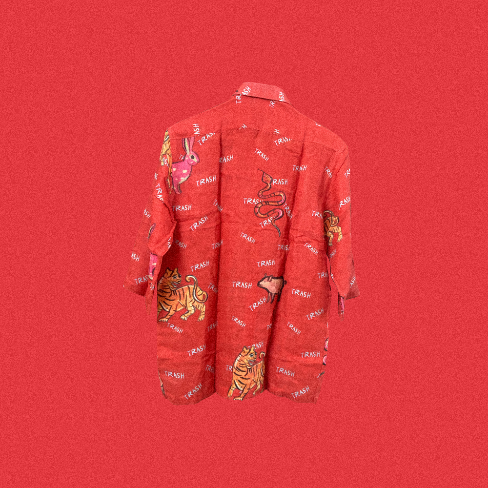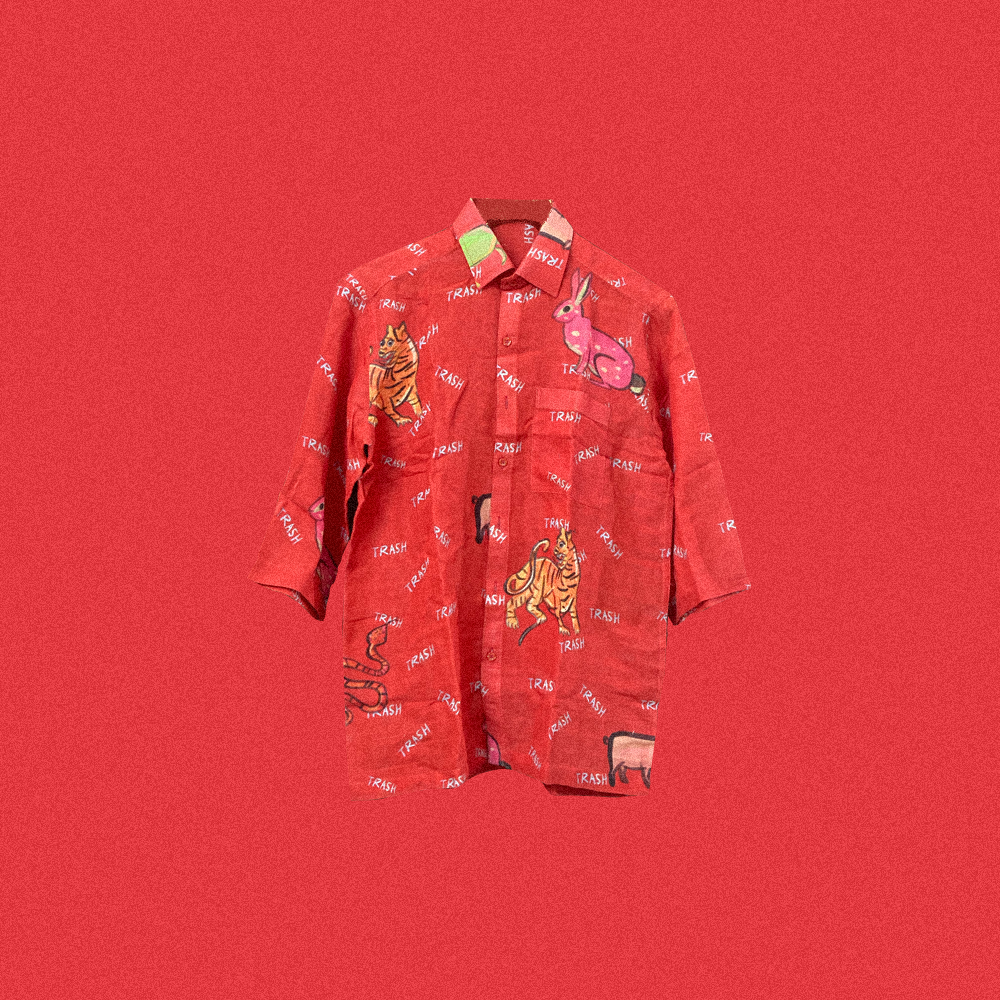 This shirt is made from organic muslin and printed with biodegradable dyes. Each shirt is cut and made upon order, and therefore the print placement will vary from the design shown on screen.