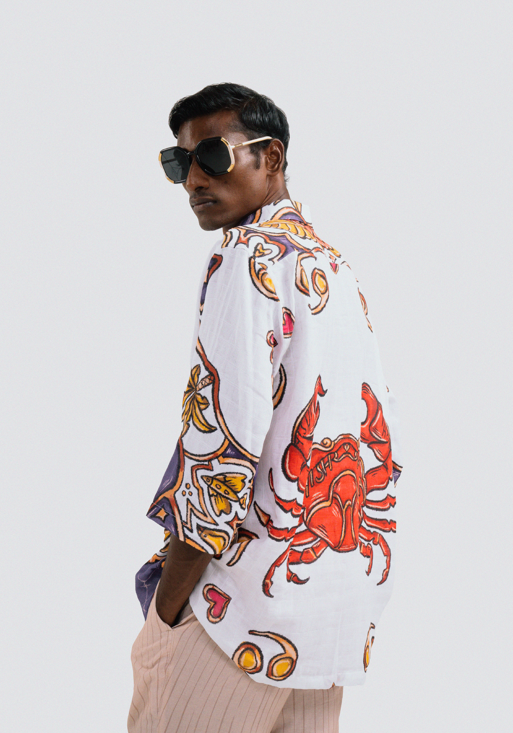 This shirt is made from organic muslin and printed with biodegradable dyes. Each shirt is cut and made, and therefore the print placement will slightly vary from the design shown on screen.