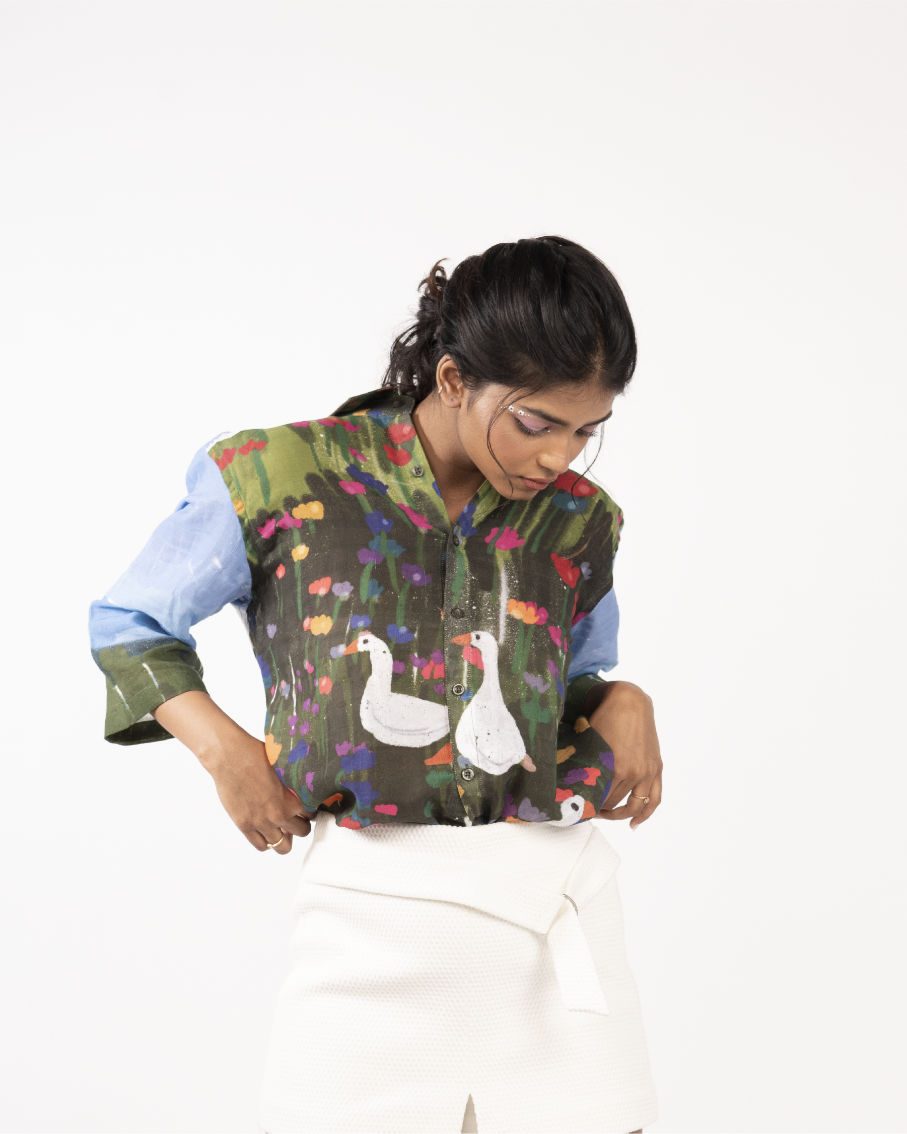 The colours on the fabric look different in different lights - please note that both the images are of the same shirt (shoot and studio flats) these look different in person as well. If you receive a product that looks like it's a different colour, please note that we check every batch and send it out - what we send you will be the final colour which is not a mistake.